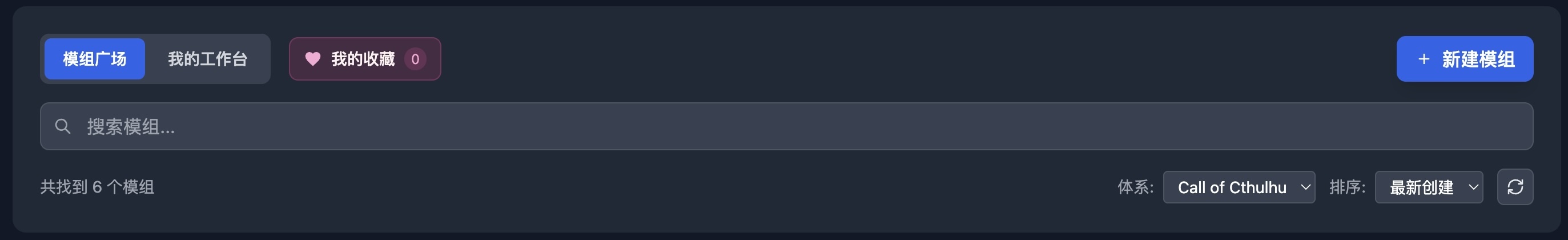 在“筛选导航区”,你除了可以切换到「我的工作台」,还可以用上方的搜索框,用模组的名字来查找你感兴趣的内容。输入模组的名字或其中的一部分,就能帮你快速定位到对应的作品; 另外你还可以通过右侧的"体系"和“排序”筛选项,根据模组的类型、与常见的排序规则,快速找到你感兴趣的模组。